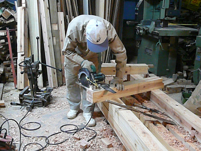 今日も棟梁は作業場で刻みです